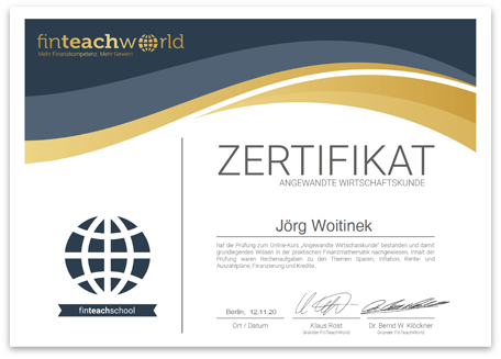 Investiere 20 Euro für deine finanzielle Kompetenz. Buche den Kurs „finteachschool – angewandte Wirtschaftskunde“ und erhalte nach bestandener Prüfung das offizielle Zertifikat von finteachworld!
